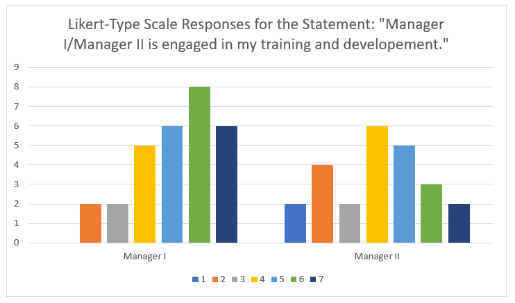 Where distributions were bimodal, annotations clarified interpretation. Leadership engagement scores were visualized through bar charts and qualitative findings were categorized and supplemented with direct quotes. The major takeaway: Invest in leadership development, especially for new managers.