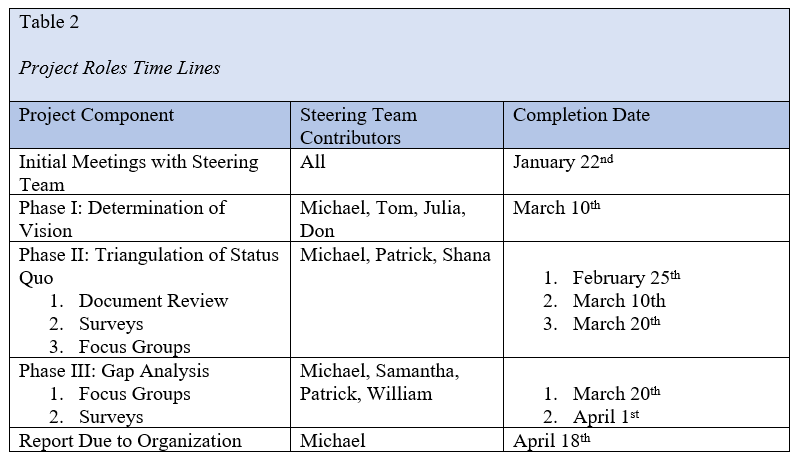 Project timelines and roles were meticulously tracked, as seen in Table 2.